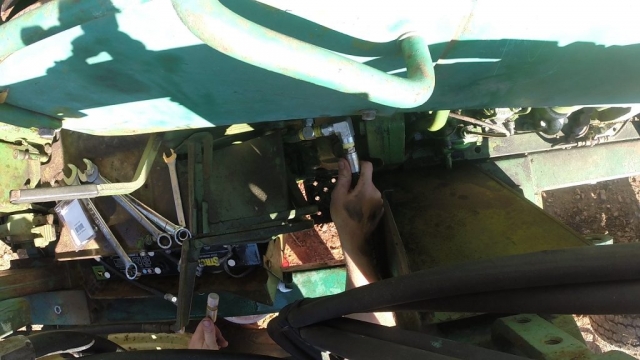 Now if your tractor is not already running go ahead and start it up. Set your throttle to about 1500 RPMs. Make sure the tractor is in park and the wheels are chocked. Jump off of the tractor and check all of your new connections for leaks. If you find a leak shut off the engine, tighten as necessary and repeat. You don’t want to be messing with the hydraulics under pressure so make sure to turn off the tractor.