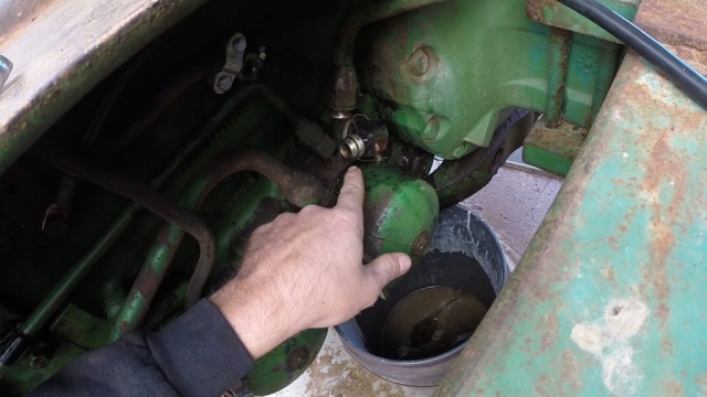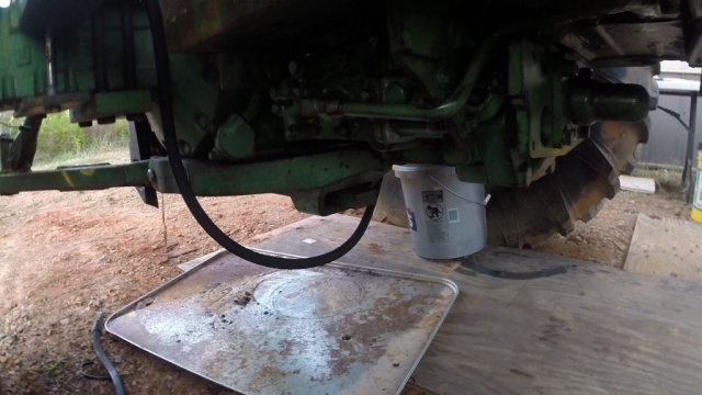 - Set a bucket under the tractor to catch the fluid that is going to come out. I lost between a 1 and 2 gallons. (Depending on if your bucket is clean you could reuse this fluid. My bucket was not clean)